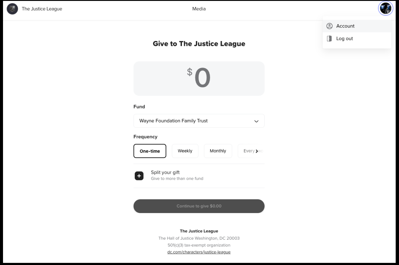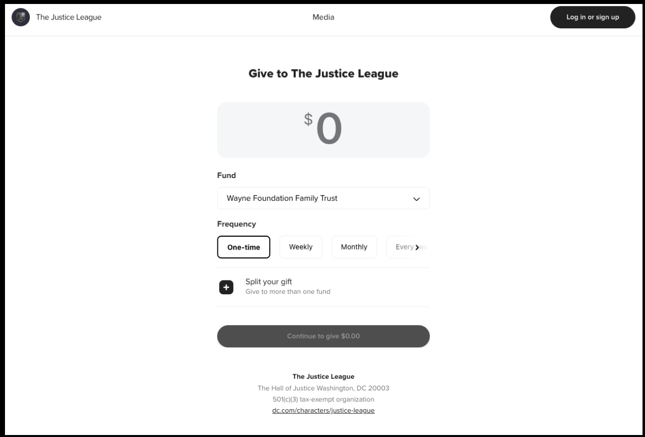 - Navigate to our Giving Link. In the upper right corner, select Log in or Sign up. Select the login and fill in the details from your WSCHURCH.org account.
