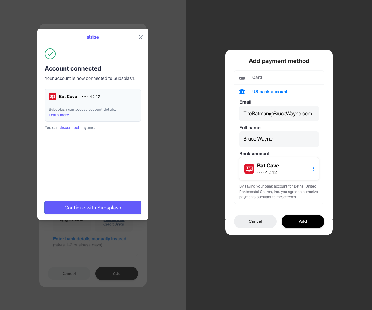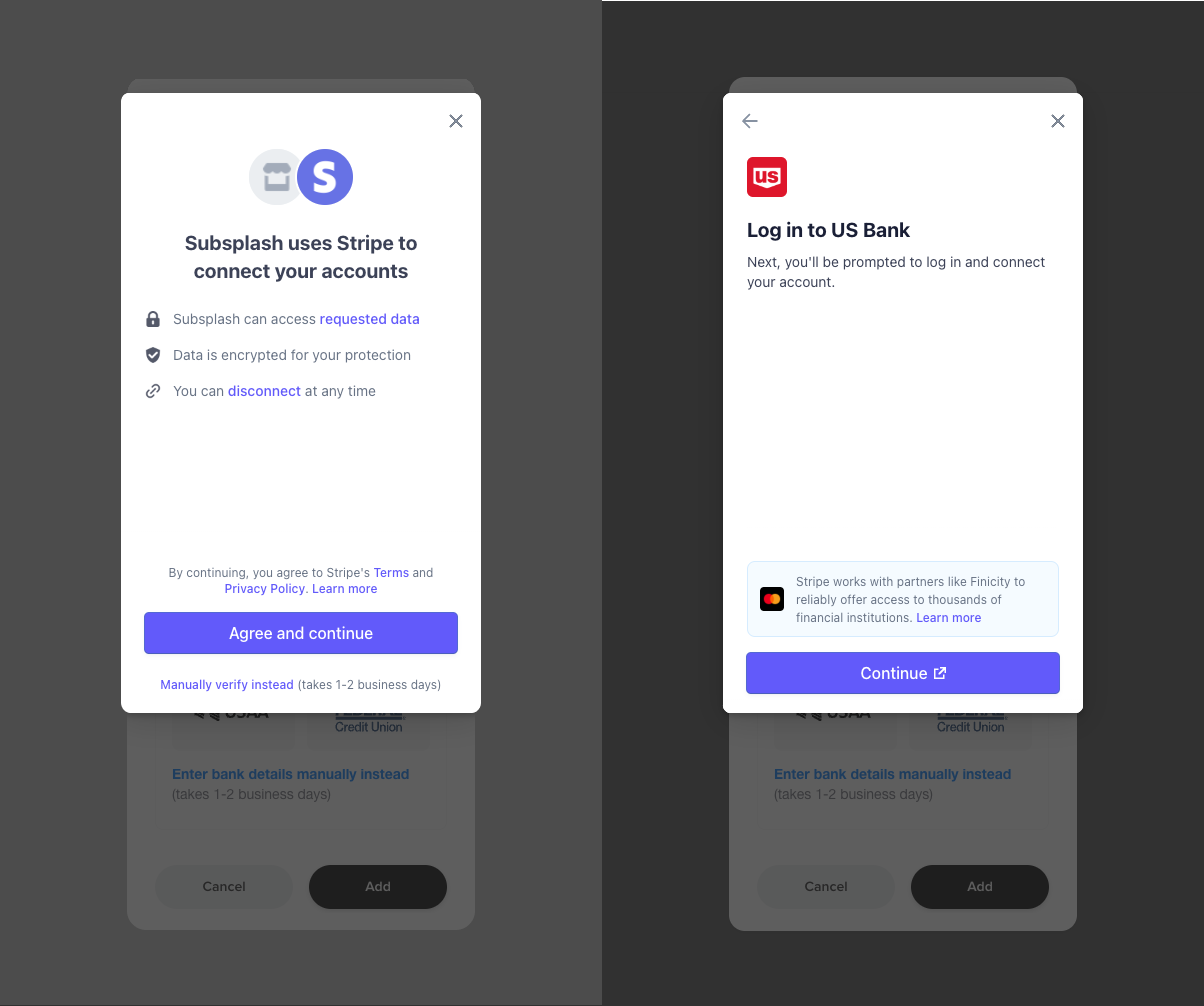 - Agree and Continue noting that Subsplash uses Stripe to connect your accounts.